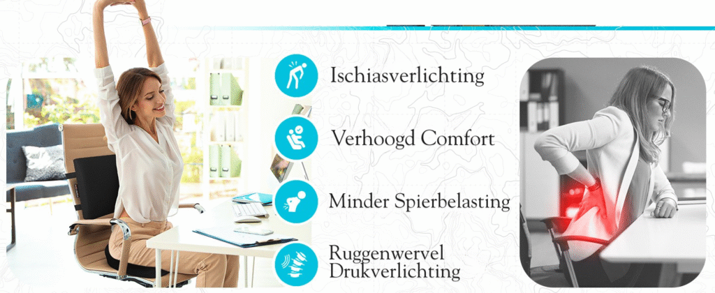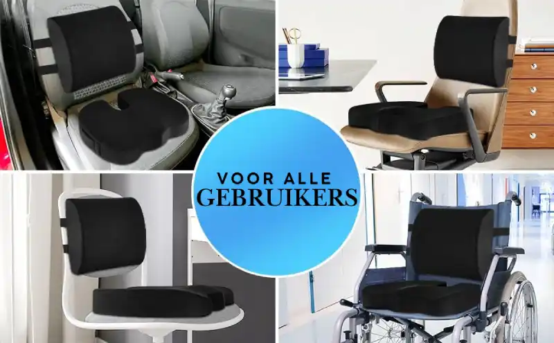 A:Voor iedereen die last heeft van rug-, stuit- of heuppijn, of simpelweg langer comfortabel wil zitten – thuis, op kantoor of in de auto.